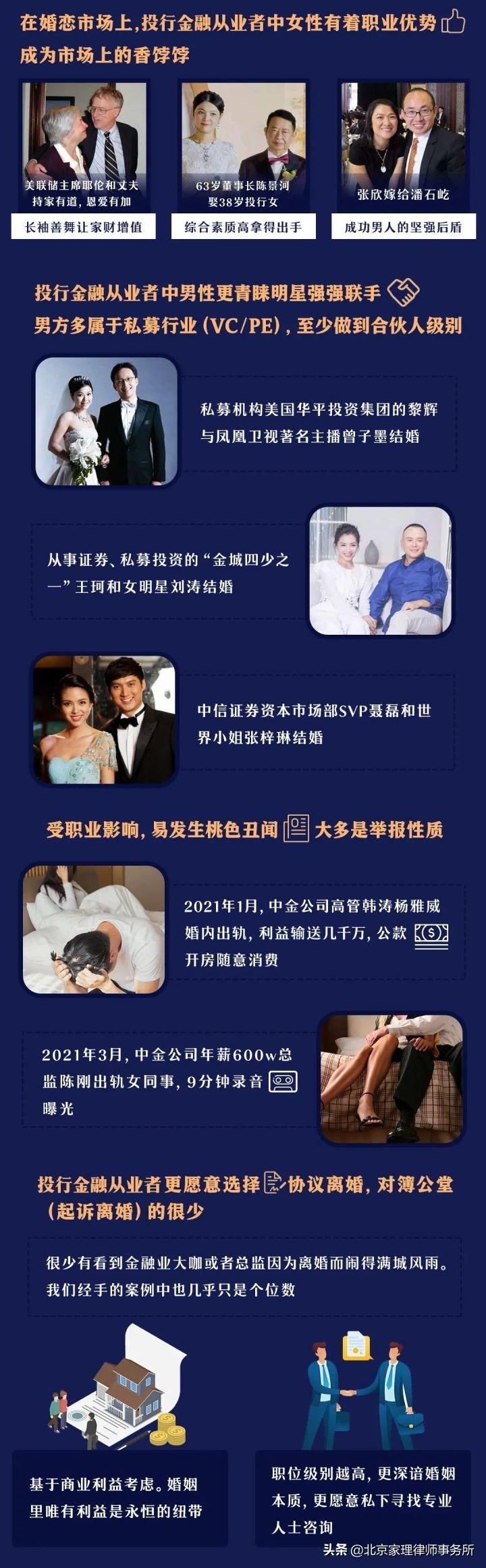 那么这个圈子里的人群的婚姻又是怎样的呢?单身多还是已婚多?都说金融圈靓丽光鲜但也是瓜田高产?从事投行金融业离婚时,会遇到哪些法律风险?