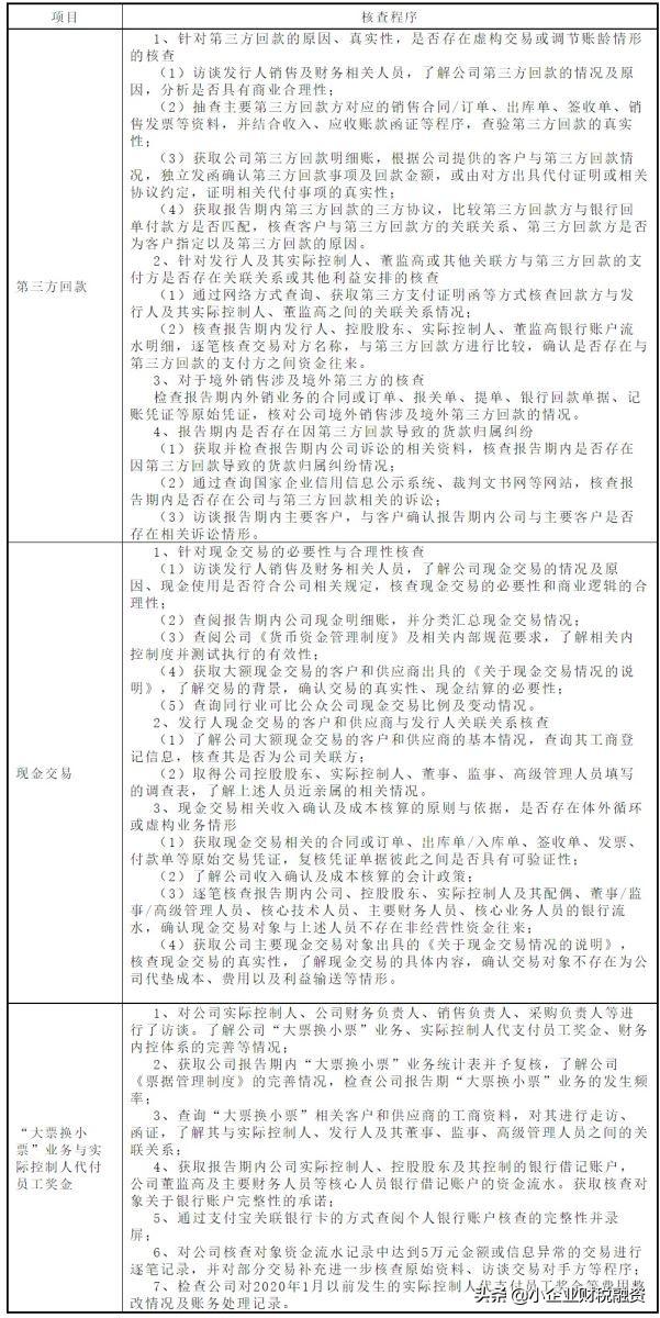 《北京证券交易所向不特定合格投资者公开发行股票并上市业务规则适用指引第1号》1-21第三方回款相关内容与《首发业务若干问题解答(2020年6月修订》中问题43大致相同,所以此处仅列示首发问答。首发企业收到的销售回款通常是来自签订经济合同的往来客户,实务中,发行人可能存在部分销售回款由第三方代客户支付的情形,该情形是否影响销售确认的真实性,发行人、保荐机构及申报会计师需要重点关注哪些方面?答:第三方回款通常是指发行人收到的销售回款的支付方(如银行汇款的汇款方、银行承兑汇票或商业承兑汇票的出票方式或背书转让方)与签订经济合同的往来客户不一致的情况。企业在正常经营活动中存在的第三方回款,通常情况下应考虑是否符合以下条件:(1)与自身经营模式相关,符合行业经营特点,具有必要性和合理性,例如①客户为个体工商户或自然人,其通过家庭约定由直系亲属代为支付货款,经中介机构核查无异常的;②客户为自然人控制的企业,该企业的法定代表人、实际控制人代为支付货款,经中介机构核查无异常的;③客户所属集团通过集团财务公司或指定相关公司代客户统一对外付款,经中介机构核查无异常的;④政府采购项目指定财政部门或专门部门统一付款,经中介机构核查无异常的;⑤通过应收账款保理、供应链物流等合规方式或渠道完成付款,经中介机构核查无异常的;⑥境外客户指定付款,经中介机构核查无异常的;(2)第三方回款的付款方不是发行人的关联方;(3)第三方回款与相关销售收入勾稽一致,具有可验证性,不影响销售循环内部控制有效性的认定,申报会计师已对第三方回款及销售确认相关内部控制有效性发表明确核查意见;(4)能够合理区分不同类别的第三方回款,相关金额及比例处于合理可控范围。如发行人报告期存在第三方回款,保荐机构及申报会计师通常应重点核查以下方面:(1)第三方回款的真实性,是否存在虚构交易或调节账龄情形;(2)第三方回款形成收入占营业收入的比例;(3)第三方回款的原因、必要性及商业合理性;(4)发行人及其实际控制人、董监高或其他关联方与第三方回款的支付方是否存在关联关系或其他利益安排;(5)境外销售涉及境外第三方的,其代付行为的商业合理性或合法合规性;(6)报告期内是否存在因第三方回款导致的货款归属纠纷;(7)如签订合同时己明确约定由其他第三方代购买方付款,该交易安排是否具有合理原因;(8)资金流、实物流与合同约定及商业实质是否一致。同时,保荐机构及申报会计师还应详细说明对实际付款人和合同签订方不一致情形的核查情况,包括但不限于:抽样选取不一致业务的明细样本和银行对账单回款记录,追查至相关业务合同、业务执行记录及资金流水凭证,获取相关客户代付款确认依据,以核实和确认委托付款的真实性、代付金额的准确性及付款方和委托方之间的关系,说明合同签约方和付款方存在不一致情形的合理原因及第三方回款统计明细记录的完整性,并对第三方回款所对应营业收入的真实性发表明确意见。通过上述措施能够证实第三方回款不影响销售真实性的,不构成影响发行条件事项。发行人应在招股说明书营业收入部分充分披露第三方回款相关情况及中介机构的核查意见。