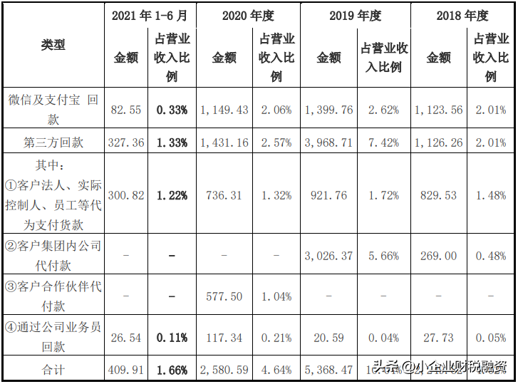 (一)第三方回款案例:凯雪冷链,北京证券交易所上市委员会2022年第5次审议会议于2022年2月25日上午召开。郑州凯雪冷链股份有限公司符合发行条件、上市条件和信息披露要求。1、关于凯雪冷链第一轮问询的回复中,要求说明微信、支付宝及第三方回款的原因及真实性,各类情形是否具有必要性和合理性,是否存在虚构交易或调节账龄情形,并结合具体情形补充披露降低第三方回款比例的措施及期后实施情况。(1)微信及支付宝、第三方回款的类型、金额及占营业收入比例报告期内,公司微信、支付宝及第三方回款的类型、金额及占营业收入比例的情况如下: