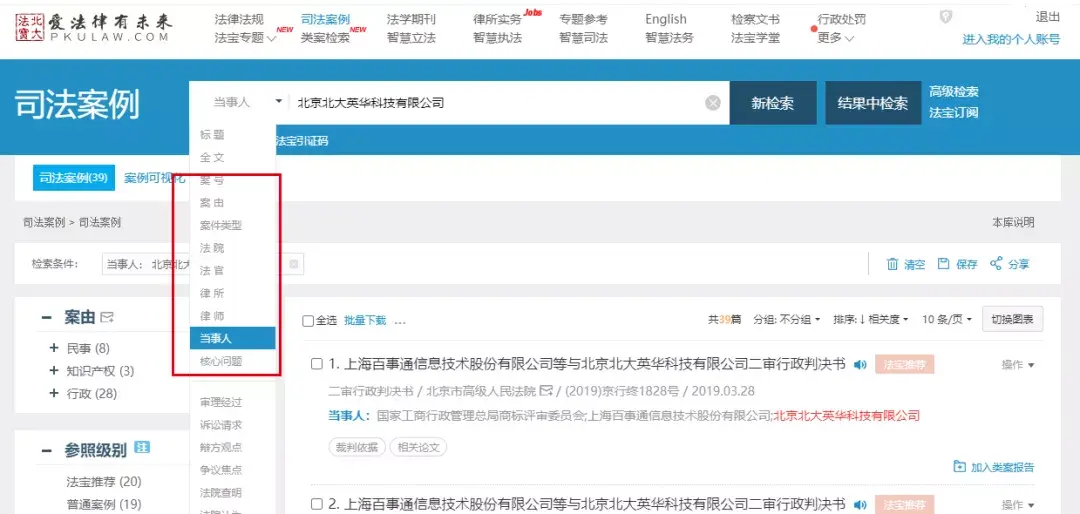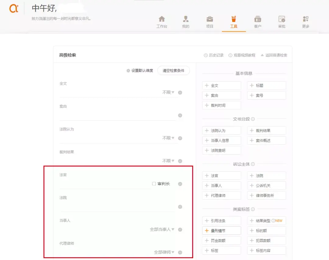 1)检索框仍可以使用“当事人”、“法院”、“法官”、“律师”作为检索关键字段进行检索;
