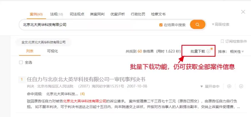 同时结合使用“批量下载”功能,导出的EXCEL或其他格式文本,仍然保留有包括“法院”、“案号”、“当事人”、“法官”、“裁判日期”等全部信息,不影响我们对裁判文书信息的获取与分析。