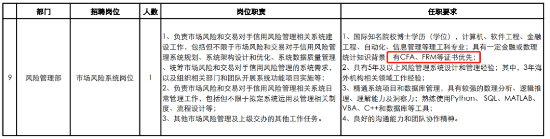 中国银行是中国历史最悠久的银行,是四大行之一,今年的全球百强银行排名中,中国银行位列第四,成绩斐然!作为行业标杆,它的招聘信息广受关注。从招聘要求来看,可以看出中国银行对FRM人才的看重: