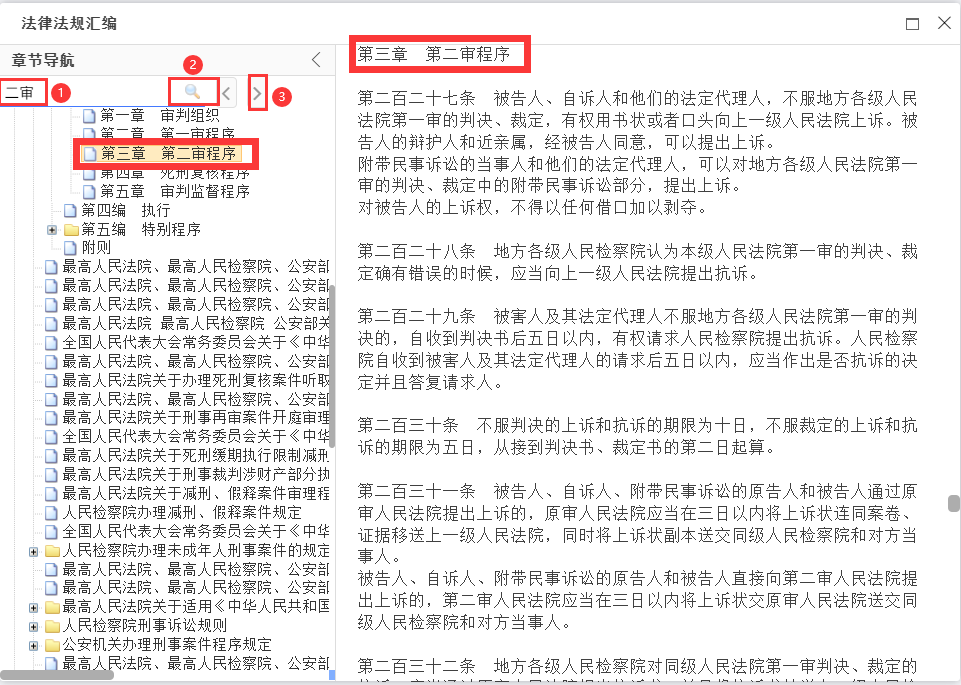 比如:想找民诉的二审,搜索“二审”,则《刑诉法》的二审、民诉的二审都会出来,只需要多点几次“>”就可以尽快找到。