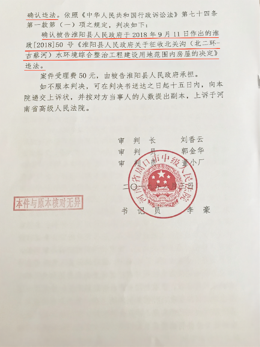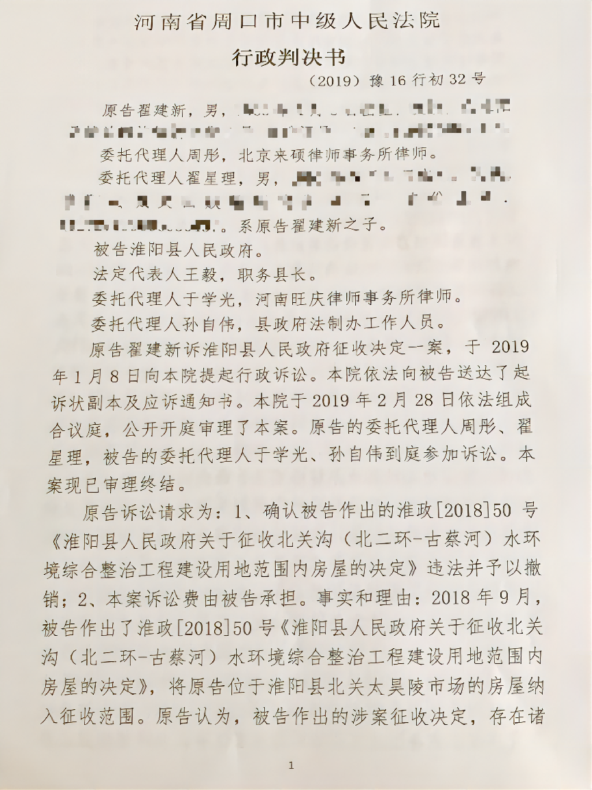 翟先生为了维护自身合法权益,向法院提起了诉讼。2019年6月3日,河南省周口市中级人民法院对本案作出判决:确认被告淮阳县人民政府于2018年9月11日作出的淮政[2018]50号《淮阳县人民政府关于征收北关沟(北二环-古蔡河)水环境综合整治工程建设用地范围内房屋的决定》违法。