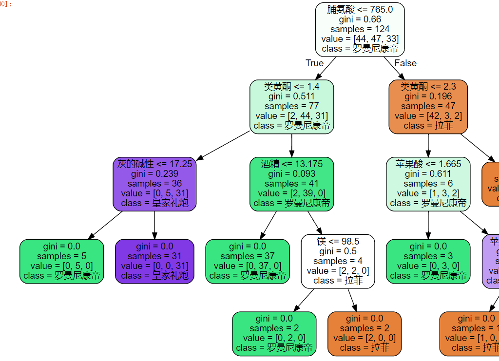 可以看到,根节点的samples是124个,与训练集数量吻合。当脯氨酸小于765时,进入第二层左边那个节点,可以看到进入这个节点的样本一共77个,有44个是罗曼尼康帝,31个是皇家礼包,所以还不能确定到底是哪个,当类黄酮小于1.4时进入第三层最左边的节点,这时36个样本中有31个皇家礼炮,所以脯氨酸小于765并且类黄酮小于1.4大概率是皇家礼炮了。