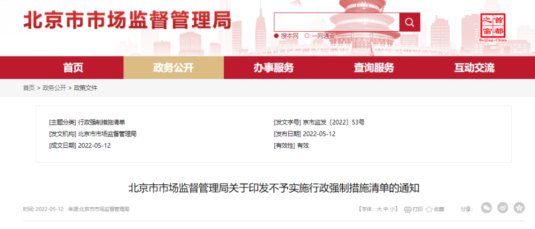 继重庆市、杭州市市场监管部门印发不予实施行政强制措施清单,近日北京市市场监管局印发不予实施行政强制措施清单,一起来看: