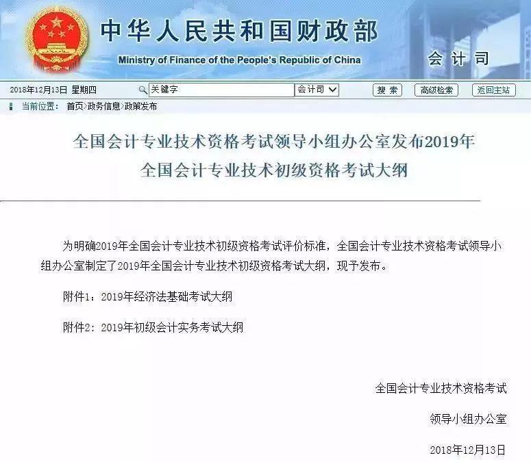 近日,国家财政部会计司重磅发布《2019年全国会计专业技术初级资格考试大纲》。