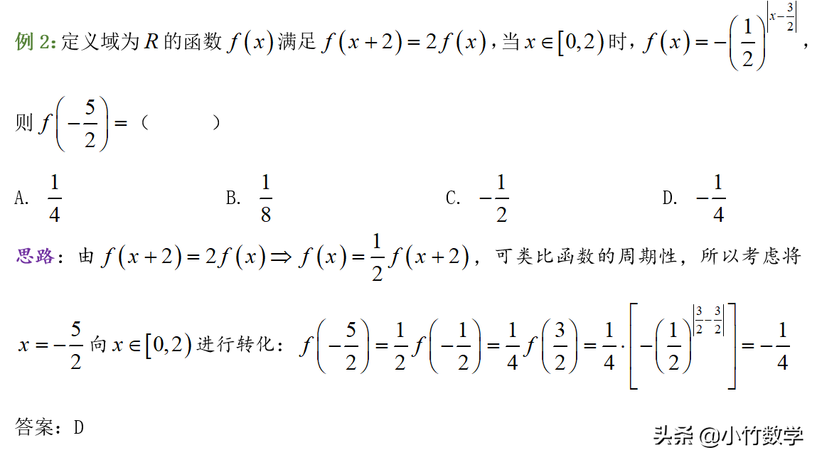 例2中f(x)虽然不是周期函数,但函数值关系与周期性类似,可理解为:间隔2个单位的自变量,函数值呈2倍关系。所以在思路上仍可沿用周期性的想法,将自变量向已知范围进行靠拢。