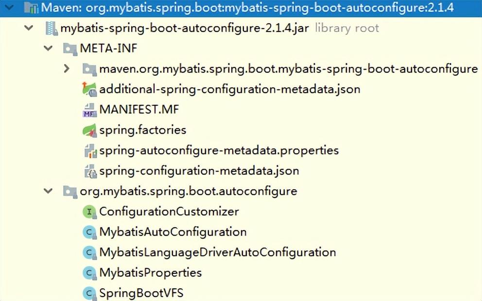 其中xxx-jdbc、mybatis、mybatis-spring是mybatis关键依赖,其中xxx-autoconfigure就是自动配置相关的jar包,里面包含内容如下: