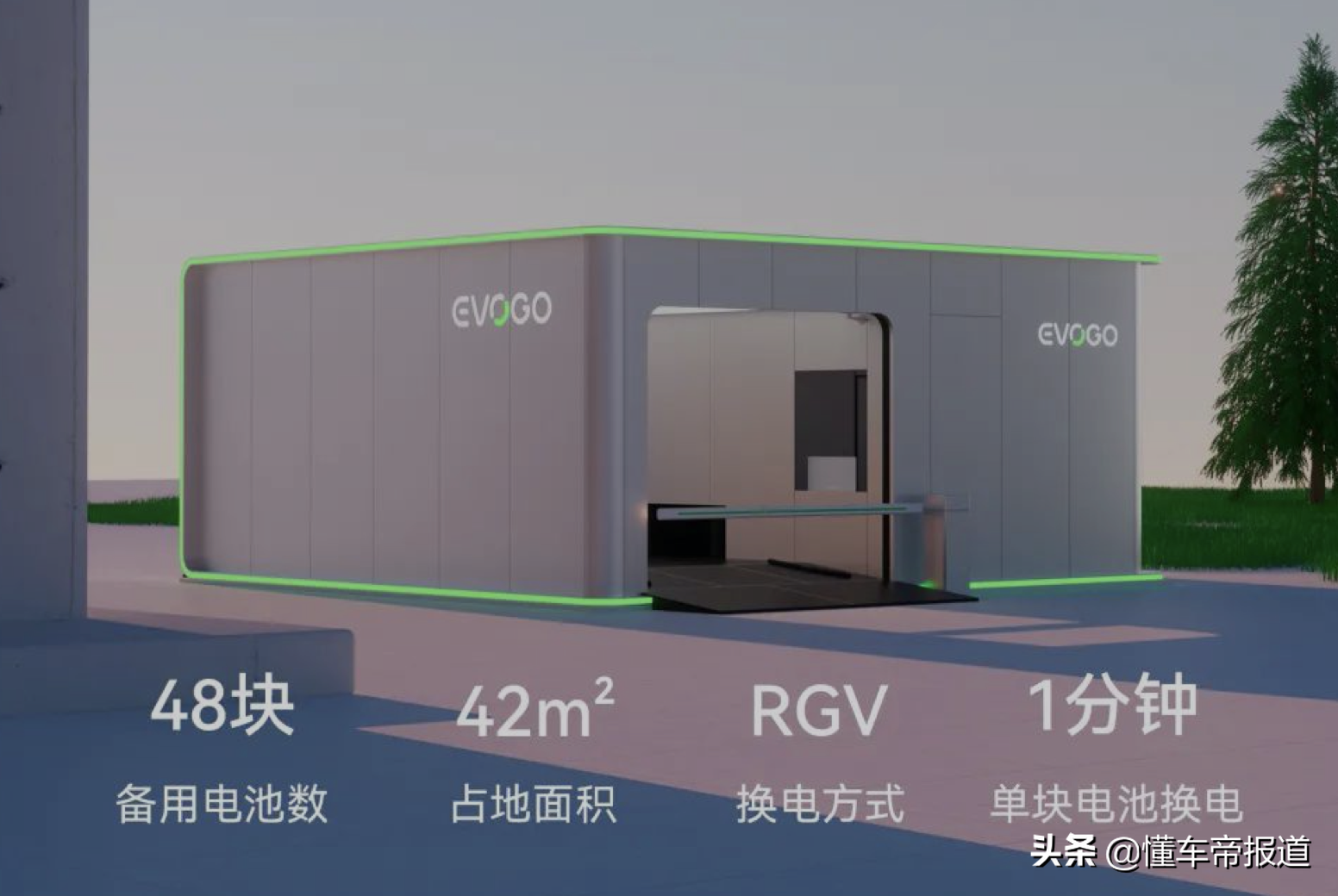 具体来看,时代电服表示,换电运营合伙人可选择合营、加盟的合作模式。海报中显示,宁德时代EVOGO换电站备用电池数量为48块,占地面积42平方米,换电方式为RGV(注:该换电模式为底盘换电,主要通过RGV有轨制导车辆,蔚来、北汽等企业也采用该换电模式),单块电池换电为1分钟。