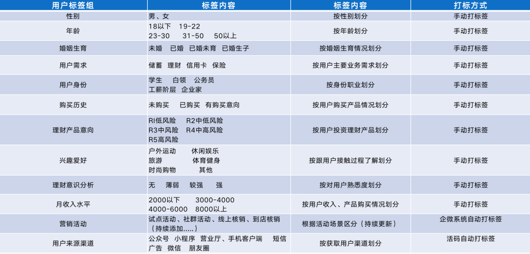 那当然,给客户进行标签备注,首先我们得需要调研银行客户有哪些标签范围,比如说它的年龄段,资产额度,产品需求等,把这些具体的标签进行一个梳理和集合,列出一个清单,后续就只需要依照清单上的标签组去给客户进行标签备注。