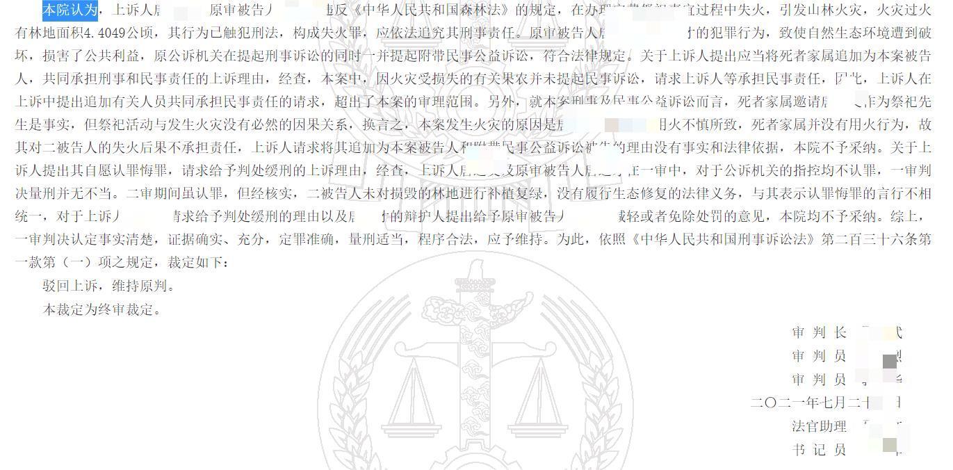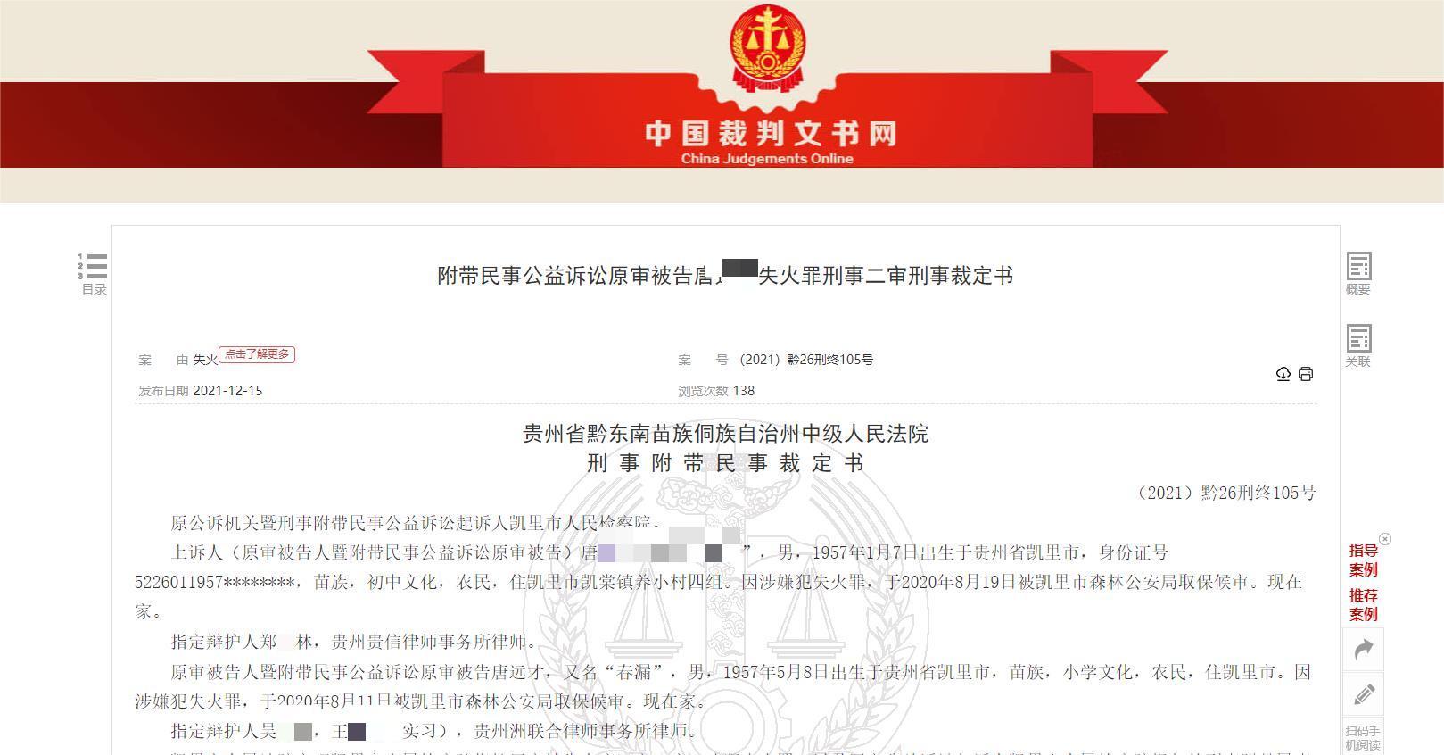 今天的案例就是一个因为祭祀先生在做“法事”的时候不慎引发山火,造成严重后果而被判刑的真实案例,案子发生在2020年3月21日,案发地点在贵州省凯里市的一个农村,最终祭祀先生及点火的人因“失火罪”而被判刑。