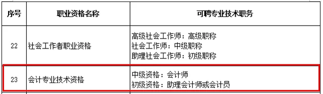 北京市人社局也发布了《关于建立北京市专业技术人员职业资格与职称对应关系的通知》,通知中确定了46项职业资格的对应关系,即职业资格中的会计专业技术资格的初级资格可以对应助理会计师或会计员,中级资格可以对应会计师。专业技术人员可直接认定相应职称,并可以此作为申报高一级职称的条件,用人单位也可择优聘任相应的专业技术职务。