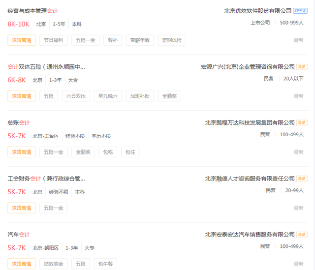 下面是在智联上找到的关于初级会计的薪资截图,大家可以参考: