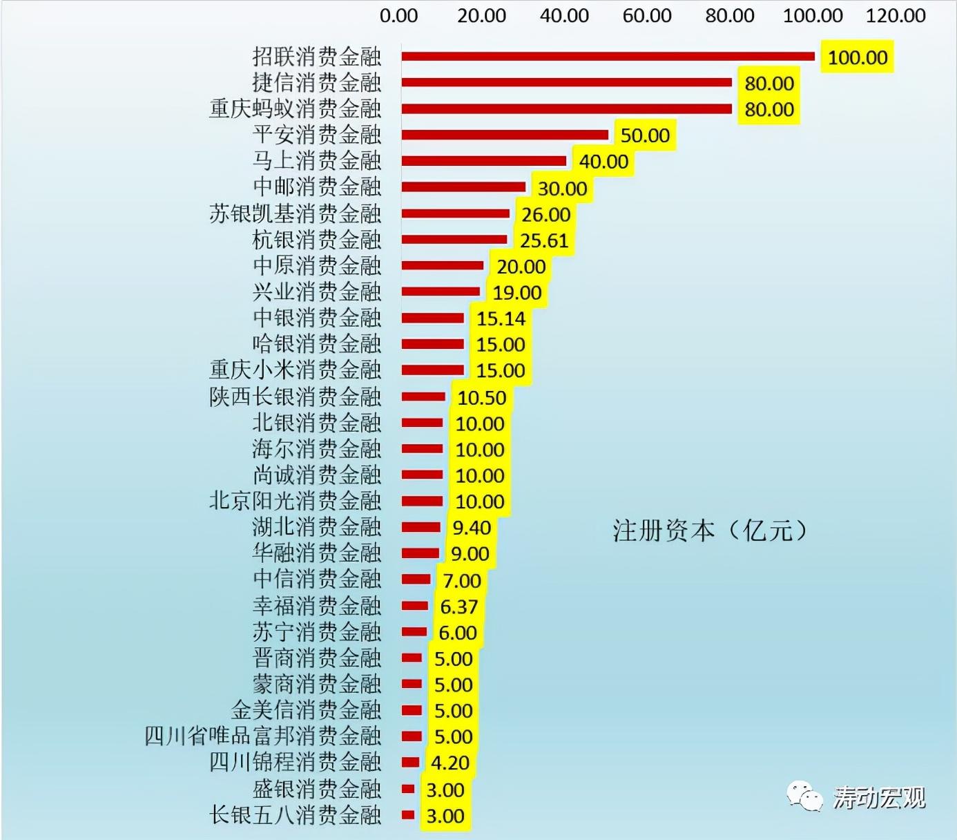 2、目前合计有9家消费金融公司的注册资本超过20亿元(含),依次为招联消费金融(100亿元)、捷信消费金融(80亿元)、蚂蚁消费金融(80亿元)、平安消费金融(50亿元)、马上消费金融(40亿元)、中邮消费金融(30亿元)、苏银凯基消费金融(26亿元)、杭银消费金融(25.61亿元)以及中原消费金融(20亿元)。