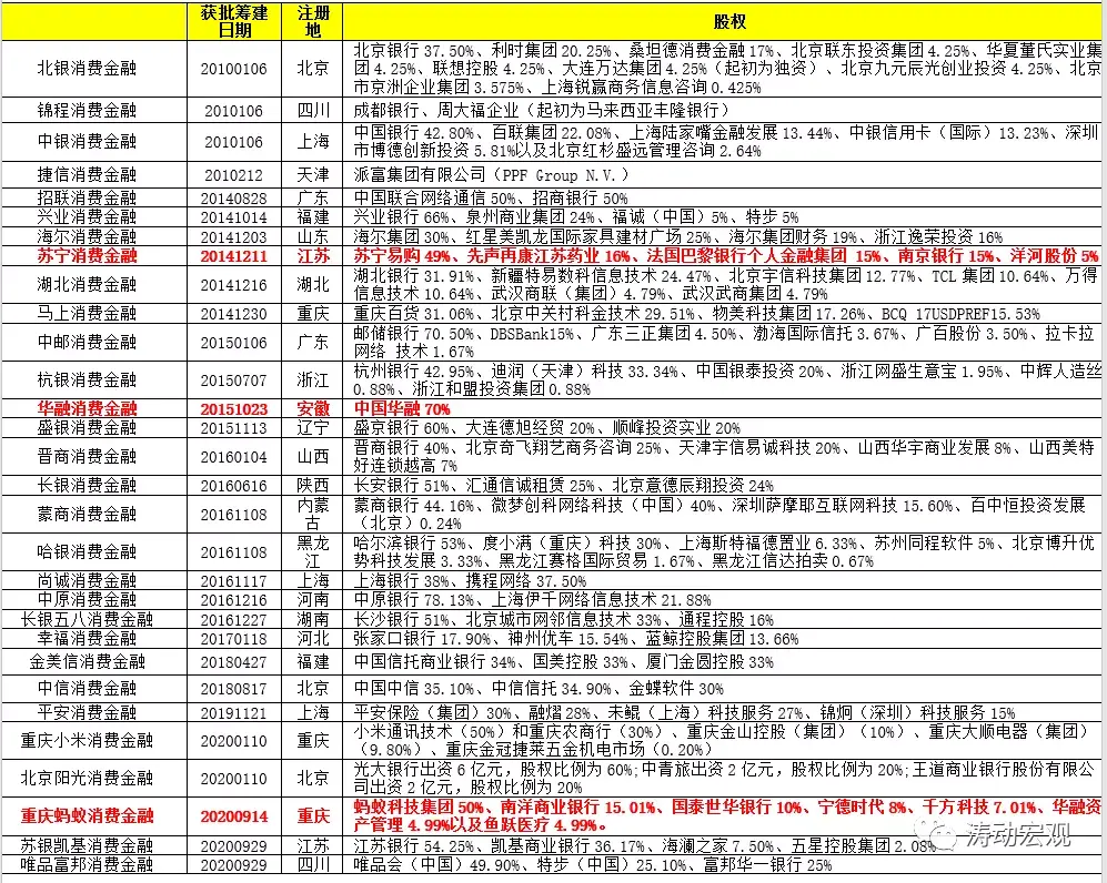 按批筹时间顺序依次为北银消费金融(北京银行35.29%)、锦程消费金融(成都银行38.86%)、苏宁消费金融(南京银行15%)、湖北消费金融(31.91%)、杭银消费金融(杭州银行41%)、盛银消费(盛京银行60%)、晋商消费金融(晋商银行40%)、陕西长银消费金融(长安银行51%)、蒙商消费金融(蒙商银行44.16%)、哈银消费金融(哈尔滨银行53%)、尚诚消费金融(上海银行38%)、中原消费金融(中原银行78.13%)、长银五八消费金融(长沙银行51%)、幸福消费金融(张家口银行17.90%)、小米消费金融(重庆农商行30%)、苏银凯基消费金融(江苏银行50.10%)。这其中有一家地方性银行为农商行,即重庆农商行。