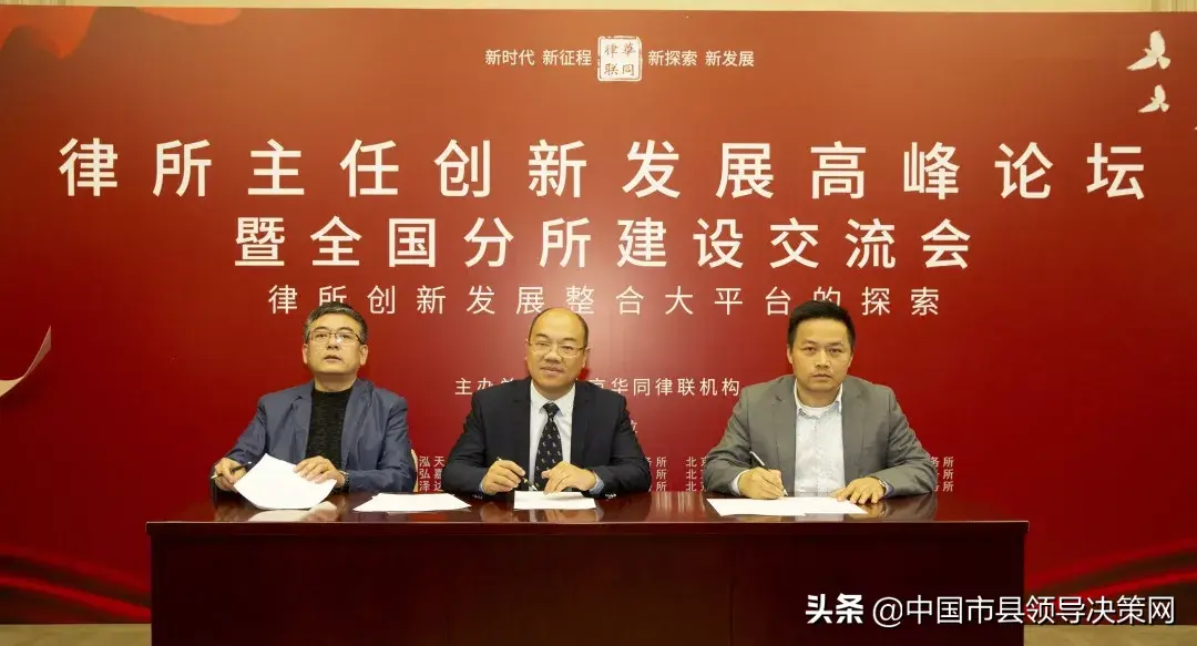 北京华同律联机构创始人魏英虎、黄志兴、吴亚平与广东、福建、山西等参加会议的律师事务所主任签署了《成员所服务协议》及《分所筹建意向协议》。