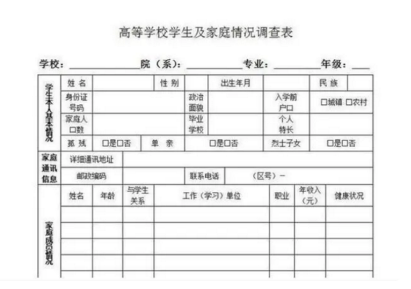大学录取通知书信封中,都有夹着一张家庭情况调查表,需要学生如实填写,到了大学后,辅导员根据家庭情况和低保证、残疾证、失业证等家庭贫困证明,进行助学金的评估。