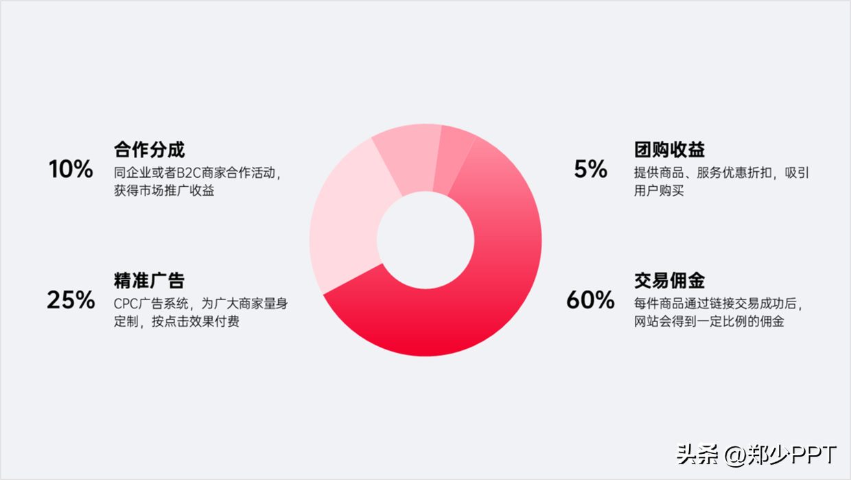 其次,用一组圆环图展示,同时把图表配色从浅到深色展示。