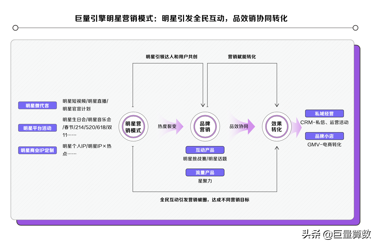 巨量引擎明星营销模式,是基于大量的明星资源与国民级平台能力,通过明星微代言、明星平台活动、明星商业IP等多种模式,配合互动产品玩法、流量资源投放,最终达成营销破圈、私域沉淀及GMV转化的品效协同一体的营销目标。
