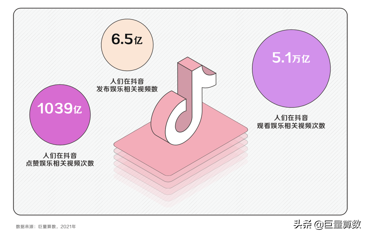 作为娱乐内容生产及消费的主要场景,2021年,抖音用户观看了5.1万亿次娱乐内容,发布了超过6.5亿条娱乐内容,点赞了超1039亿次娱乐内容。