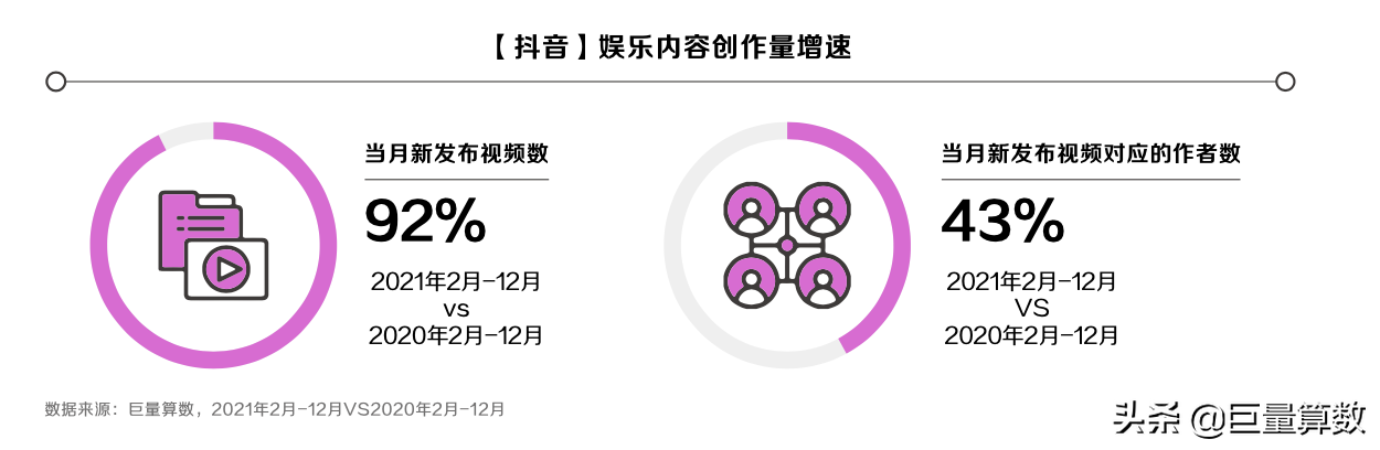 以抖音平台为例,娱乐相关的视频量月均创作量超5423万条。娱乐内容视频数量增速达92%(2021年2月-12月vs2020年2月-12月)。娱乐相关内容创作者数量持续上升,月均发布娱乐相关视频作者数超1829万人。发布娱乐内容视频人数增速达43%(2021年2月-12月vs2020年2月-12月)。