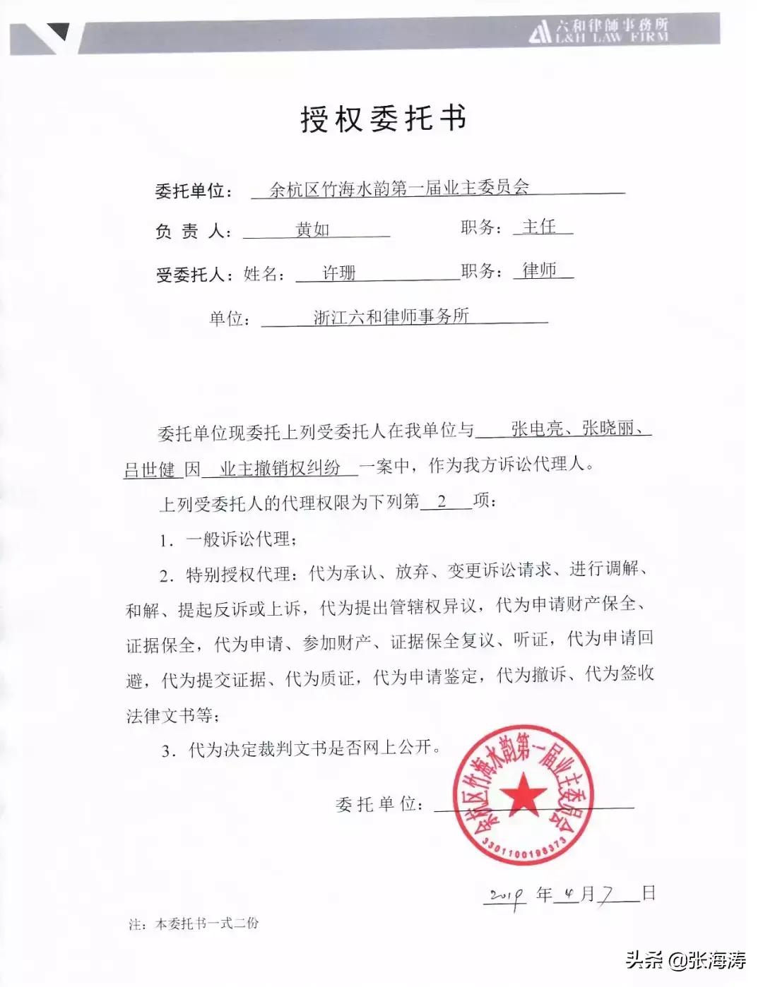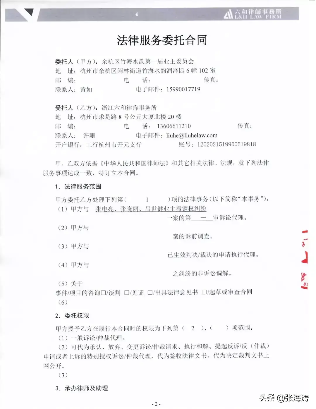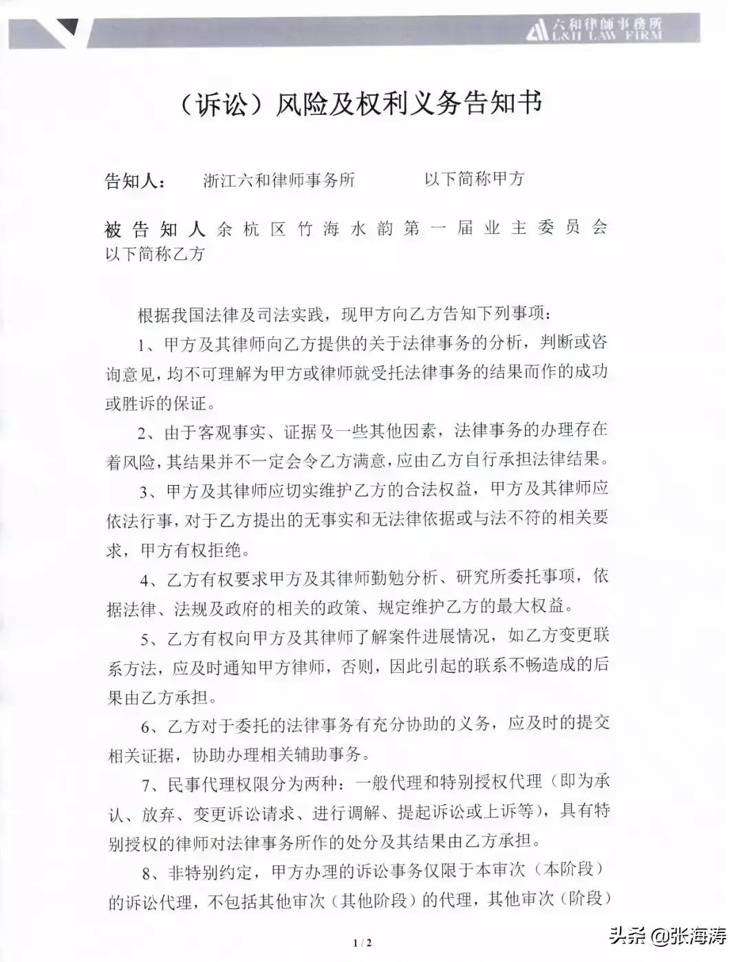 业委会接到浙江省余杭区人民法院传票,公告业主后,进行了认真的讨论(关于竹海水韵第一届业主委员会收到浙江省余杭区人民法院传票一事的公告)决定聘请杭州六和律师事务所律师应诉,律师费用从小区经营性收入中开支,共计2万元,特此公告。(后附法律服务委托合同等文本,待杭州六合律师事务所盖章后正式生效)