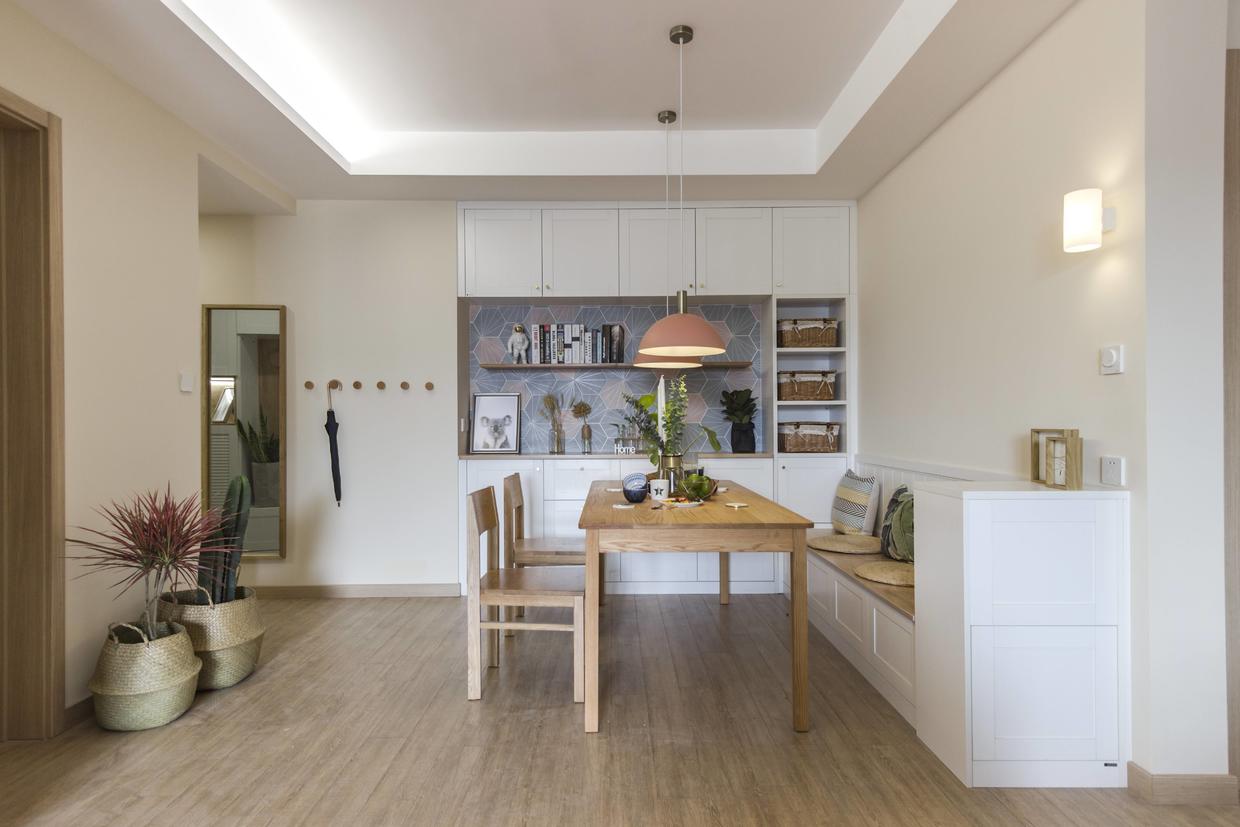 靠餐桌的一角摆放一个盆栽的绿植,餐桌面在放几束自己喜欢的植物,给你不一样的就餐氛围,旁边的小餐柜下方当书架,上方可以放很多东西,比如水壶、果盘、买回来的快递可以随手先放在桌子上。