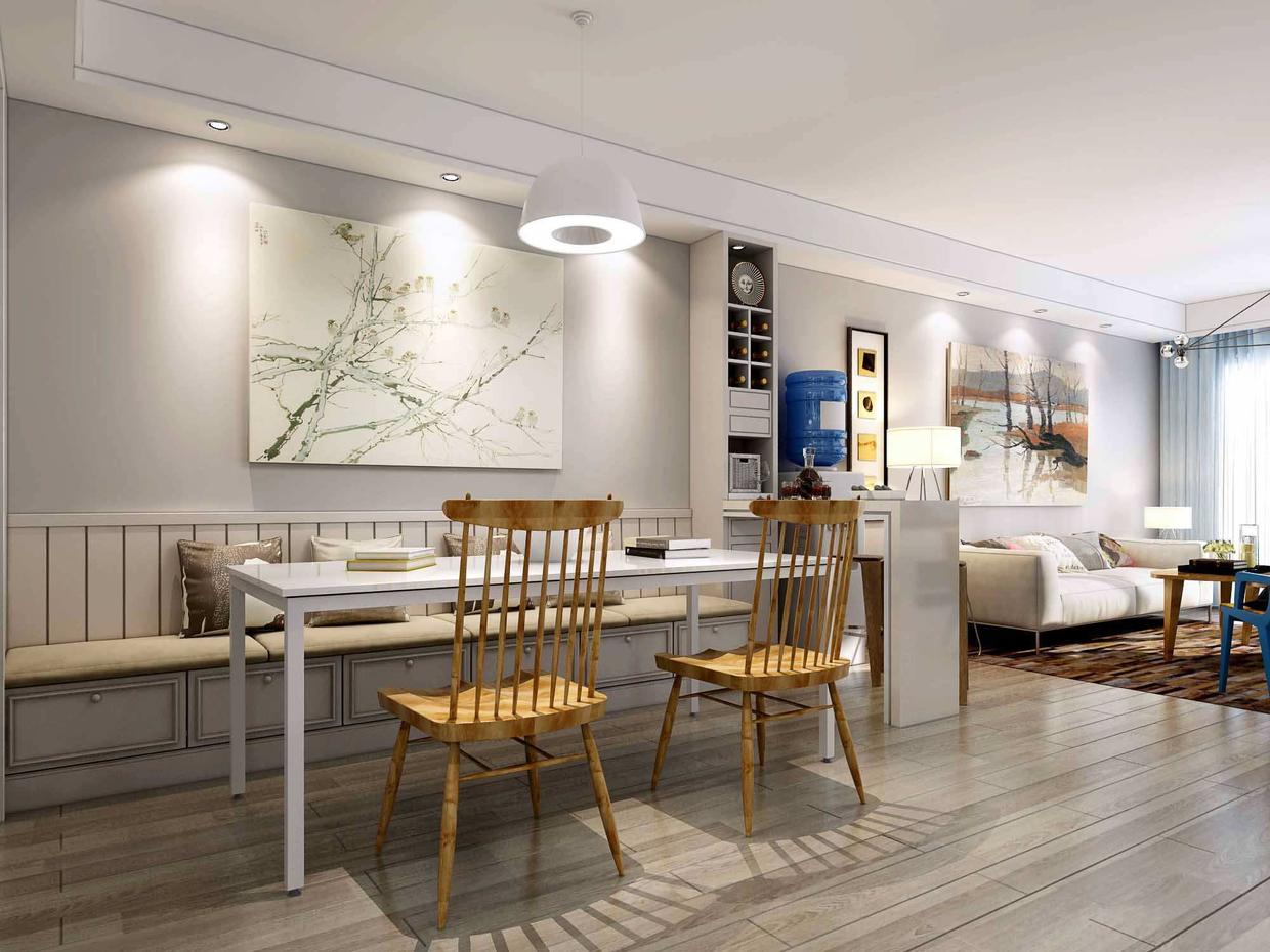 最简约的餐厅设计,没有过多的装饰,卡座背景墙用护墙板装饰,装饰的同时起到保护墙面的作用,墙面的挂画搭配长方形的吧台类餐桌,清新又有格调,卡座下一排抽屉,可以放很多物品,细腿的餐桌,从视觉上更显空间宽敞。