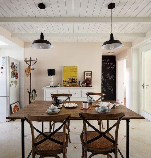 原木风的餐桌,餐椅,就连墙面的装饰画、展示品、以及门框、隔断都用原木打造,自然纯朴,比较适合北欧风、日式风格。