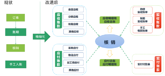 我们可以做一个简单的对比,可以看到在之前手工入账的模式进行升级之后变成了全链路自动化的核销的财务中心模式。