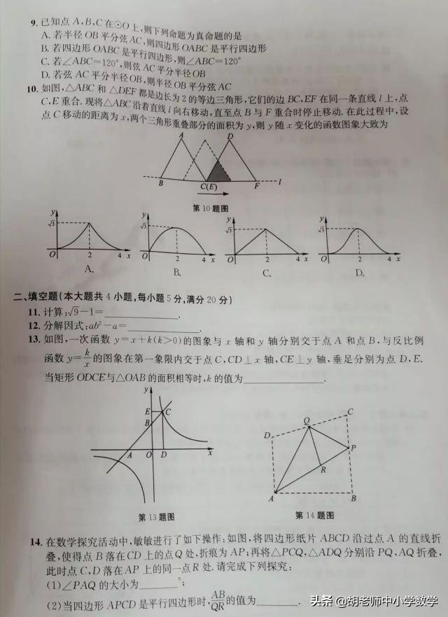 第13题主要考查一次函数和反比例函数的图像和性质,解题的关键是用含有字母K的式子表示出三角形的面积和矩形的面积,然后联立方程解方程即可,涉及到一次函数与坐标轴的交点问题,反比例函数k值的几何意义等知识点,题目具有一定的综合性,难度中等偏上;