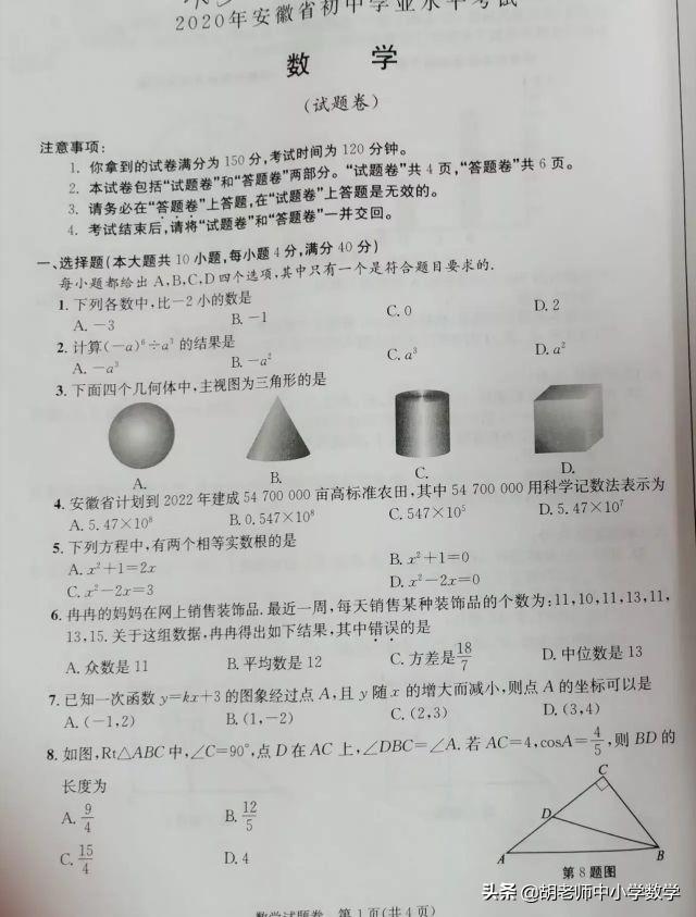 2020年安徽中考数学试卷卷面满分150分,要求学生在120分钟内完成,整套试卷包含8个答题,共计23个小题,其中第一大题是选择题,包含10道小题,每小题4分,选择题合计40分;第二大题是填空题,包含4道小题,每小题5分,填空题合计20分;第三、四、五、六、七、八大题都是解题题目,共计9道小题,解答题合计90分。