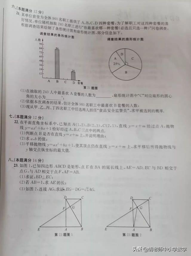 第20题是圆的综合证明题,第一问证明两三角形全等,这两三角形有一组公共边,还已知一组对应相等的边,再利用直径所对的圆周角等于90度证明两个三角形是直角三角形,运用HL定理即可证明全等;第二问利用同弧所对的圆周角相等,等腰三角形的判定及三线合一的性质,等角的余角相等等性质定理进行边角的转化即可证明,本题难度中等偏下;