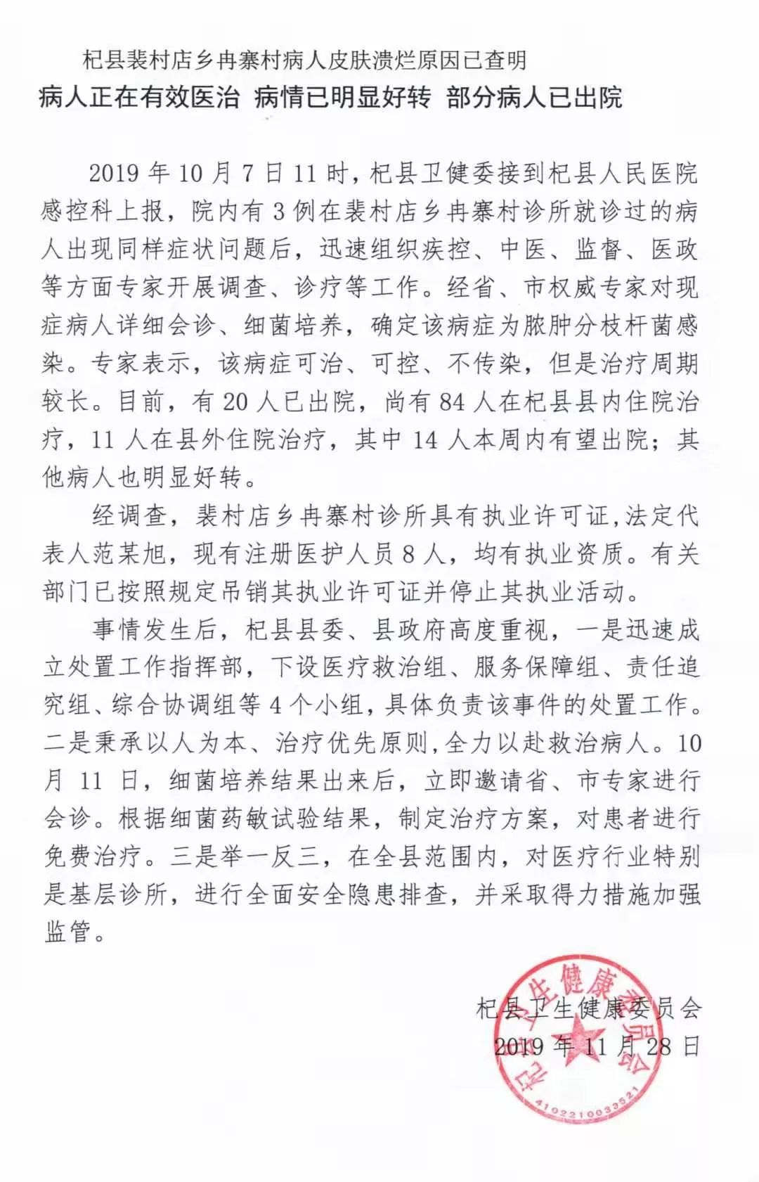 到底为啥反复感染从10月20日起,王萍陆续在乡卫生室开了11个洞。从那会儿开始,她的丈夫徐建设得每天开车50公里,往返于家里和乡卫生室之间。输液每天都要进行,换药隔天一次,王萍向单位请了半年假,徐建设则辞掉了工地上的临时工。11月初,乡卫生室工作人员又陆续通知前来看病的患者前往县内医院,患者被分流安排至杞县中医院、县中心医院、县人民医院及县人民医院旧址住院治疗。杨玉振表示,感染或与与扎针时天气炎热、患者出汗多有关。“在8月中下旬在范晨旭处扎针的人中,并非所有的人都发病,(发病的)只占当时扎针的一小部分。”他告诉深一度记者,目前裴村店乡卫生院党委书记和院长,已被降职为副书记和副院长。县卫健委的主要负责人也正接受纪委监委问询。朱庆立告诉记者,10月10日,县卫健委组织成立救治专家组。在通过第三方机构检测后得出感染细菌为脓肿分枝杆菌,10月14日制定初步的治疗方案,此后进行药物敏感实验,10月25日在省、市专家讨论后调整治疗方案。按照目前的治疗情况,整个群体都在好转,再有20来天患者基本上都可以出院。脓肿分枝杆菌是一种条件致病菌,在生活环境中随处可见,但不接触伤口就没有感染风险。脓肿分枝杆菌感染在医学中并不多见,发生几率小,且并非传染病,可以治愈。只是疗程会略长些,轻则需一两个月,重则需三四个月。朱庆立解释,一开始的“疙瘩”就是脓肿的前期。感染是从针眼开始的,然后出现红肿,流脓。为了让感染好得更快,医生会沿着针眼用手术刀切开,并放入引流条,以使得里面脓液流出来,即“扩创引流”。在扩创的过程中,有一些烂掉的肉需要切除,方便内部肉芽更快生长。但患者一开始“开口”未切除“坏肉”,恢复就慢。不少患者至今都没搞清楚自己到底是什么感染,也不知道到底要治疗多久。采访中数名患者告诉记者,自住院以来,他们从未看到过自己的病历,向医生询问病情,医生则回复“说了你们也不懂,只管好好治疗就可以了。”“医院的医生说让找卫健委,卫健委说让找医院。”王萍的丈夫徐建设称。患者与医院及主管部门的沟通不畅,带来了更多猜测与忧虑。徐丽的背上的洞从“花生大小”挖到“小枣大小”,从第一次“开口”至今,大多数时候,她只能趴在床上。徐丽开始怀疑治疗方案是否存在问题,“到底割到什么时候才是个头。”