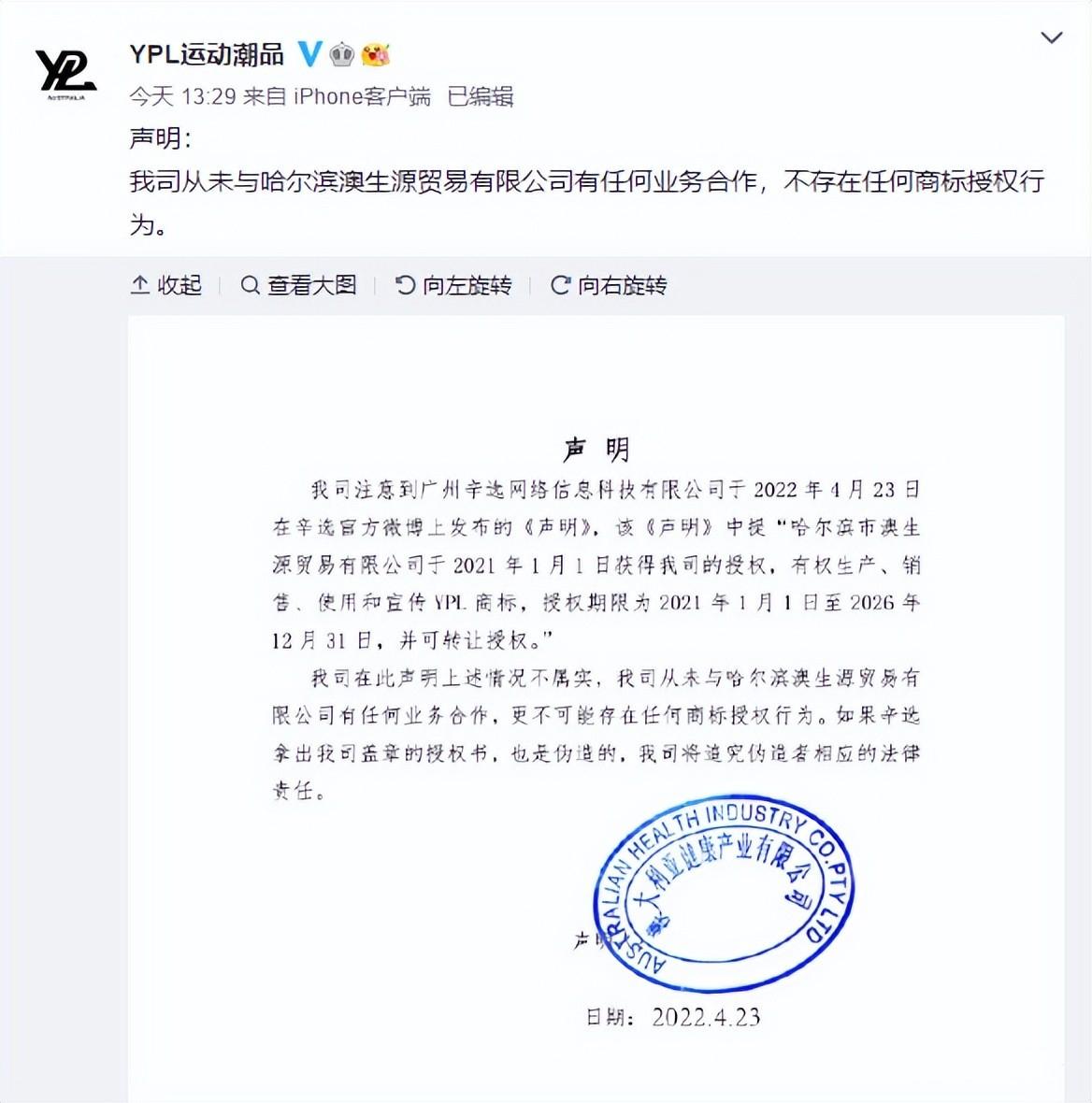 4月23日下午,“YPL”品牌方发声明称从未与哈尔滨澳生源贸易有限公司有任何业务合作,不存在任何商标授权行为。