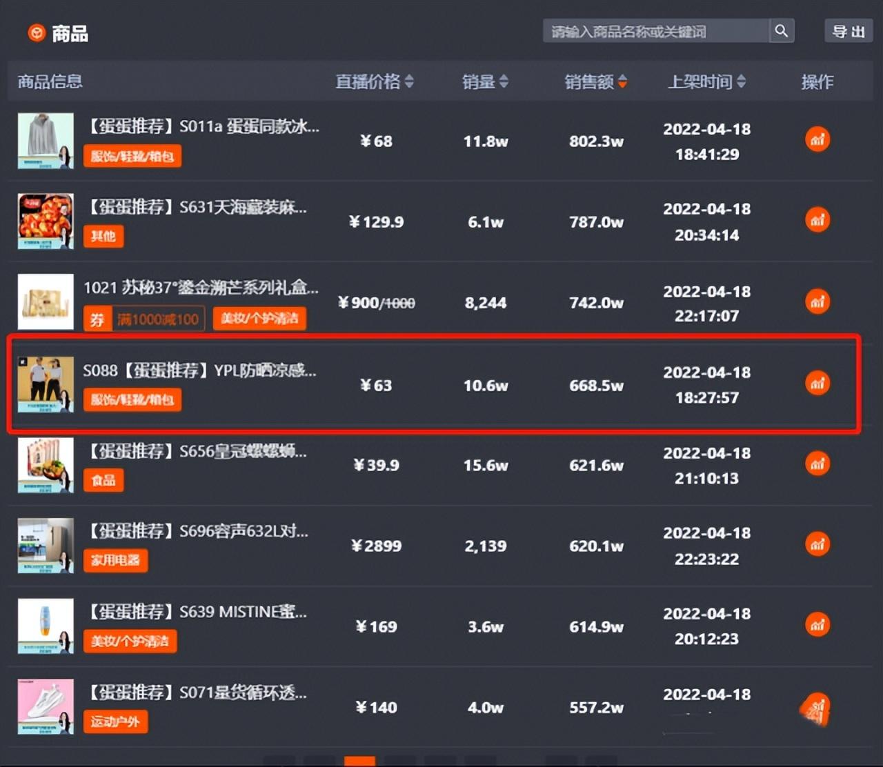 4月18日,辛巴和他公司旗下的主播“蛋蛋”在直播间带货了一款名为“YPL防晒凉感裤”的产品。