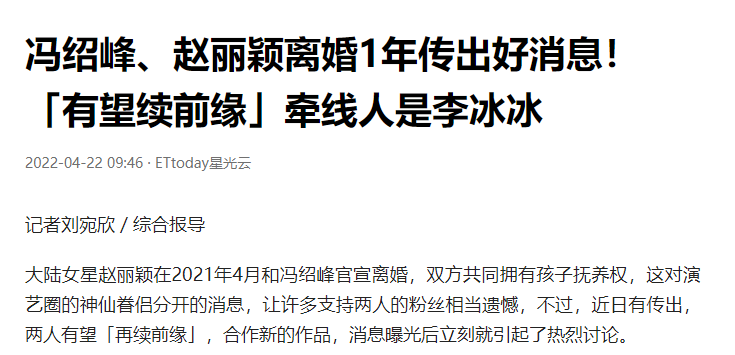 如今,台媒又报道称冯绍峰和赵丽颖要合作一部新片,有望“再续前缘”。