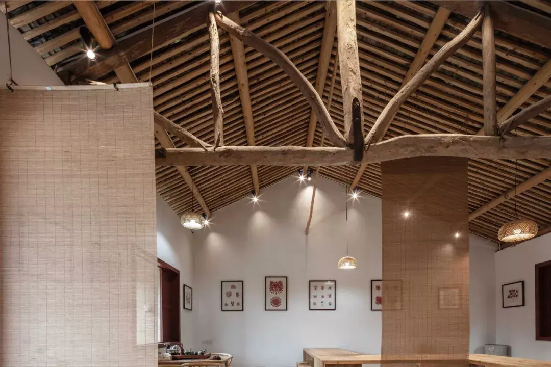 ▼中餐厅,屋顶不做吊顶,保持木纹理