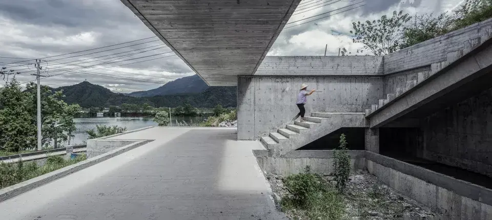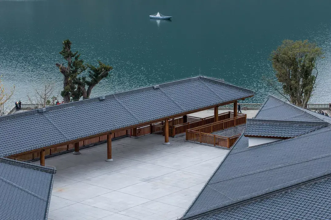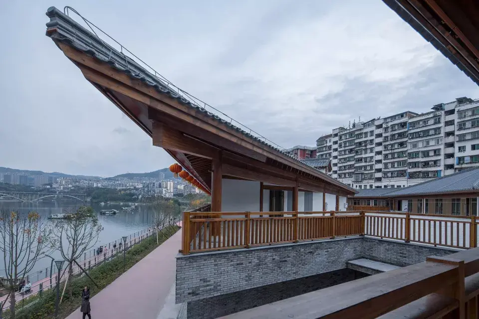 沿着毛石砌筑护坡拾阶而上,建筑体量隐藏在山坳中,沿江面展现的是数层宽阔的观景平台,来访者在深远的挑檐下几经转折,视线在江面与临山楼梯间转换,空间时而开阔时而幽狭。