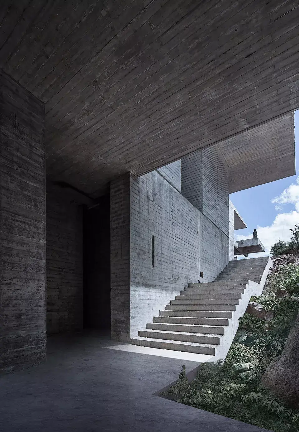 ▼酒店接待入口,片墙延伸,模糊了建筑与自然的边界