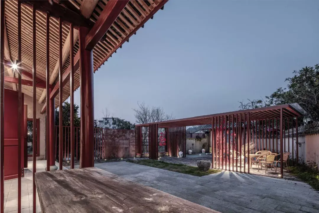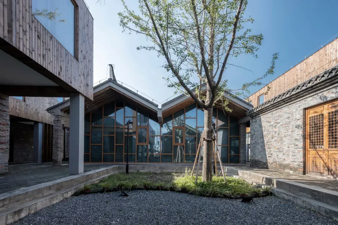 设计师通过营造纵横交错的灰空间——院落、村巷、连廊,将传统村居中的“檐下空间”极致表现,原本清晰明确的建筑边界逐渐开放。不同单体建筑空间下的功能配置在此发生了联系与交流,相对模糊化的空间边界允许原本孤立的村落文化功能在此汇合。