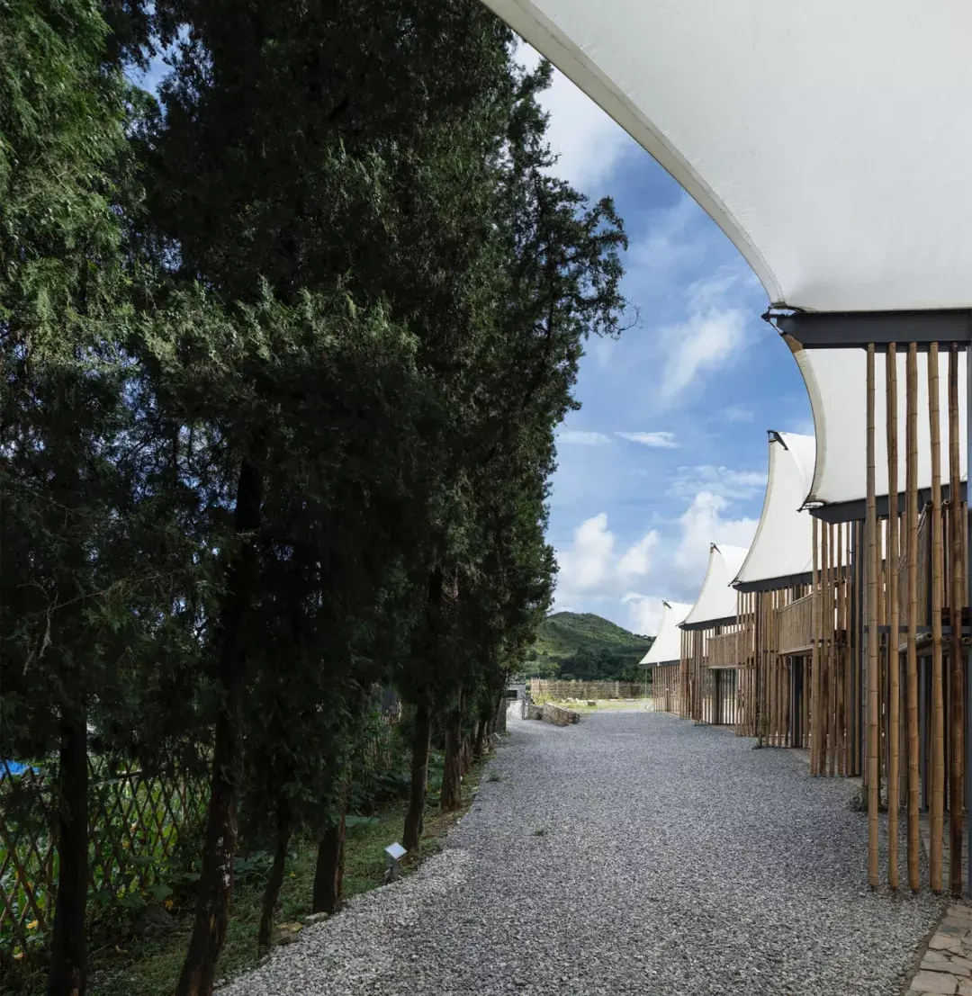 当地气候温和而多雨,遮雨和通风是建筑首要需求。通用空间(集活动、培训、宿营、用餐等功能于一体)作为营地的核心空间,采用连绵起伏的半透明海帕面张拉膜屋面来构建连续通透的遮雨空间。