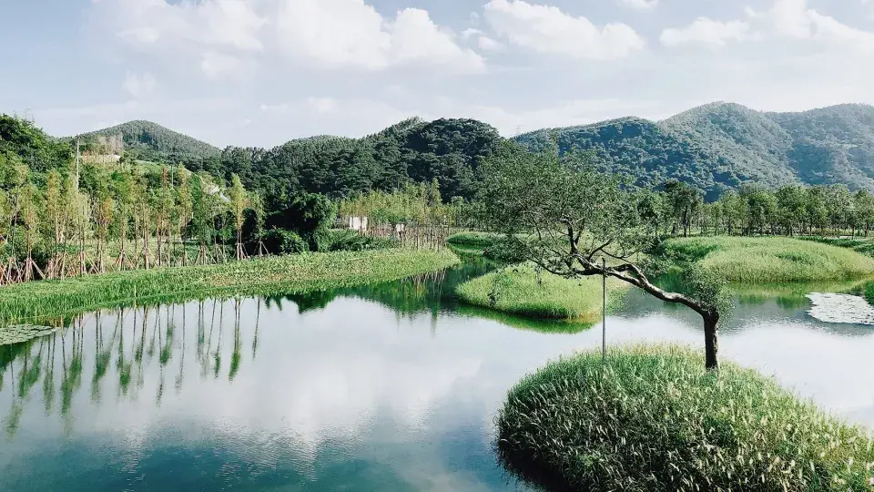 在设计开展之初,设计师就确立了利用场地中丰富的水体及原生植被资源,大面积采取轻度维护的原则和理念,以降低生态系统的负担。从山林、河塘、湿地、路径等四个方面着笔,体现对原生态的延续。