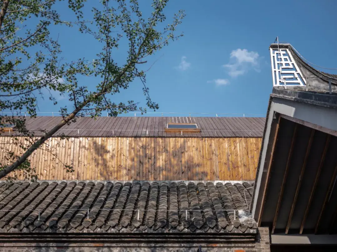 另一方面,在建筑的风格样式上,唐堡书院在传统建筑材料的语言上做出尝试。小青瓦、花格木门、花砖、镂空砖墙及叠涩的运用随处都有迹可循。