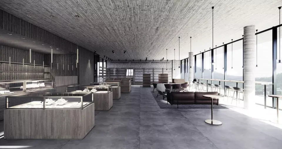 设计利用地形高差,将茶舍与接待两个功能,分为主次两栋贴合地形延展的退台建筑,逐层叠退,不仅视觉上弱化建筑体量,同时产生了大量的一线江景的露台场所。