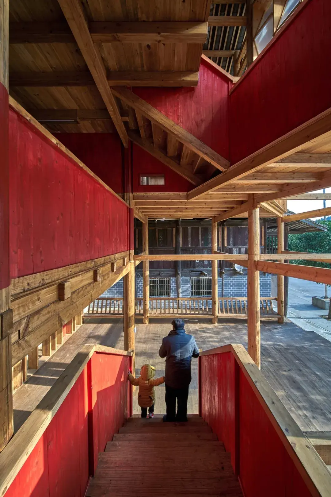 侗族建筑中的楼梯多次到访侗族村落,设计发现楼梯在村民日常生活中扮演著一个重要的角色。村民都喜欢在楼梯旁聚集,小朋友们则喜欢在上面玩耍。因此楼梯成为设计中一个重要的概念,贯穿整座书屋。