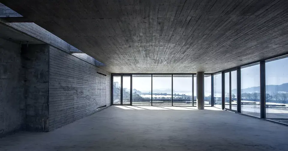 设计师选择混凝土来建造这样一幢坐落于乡村环境中的公共建筑。混凝土作为一种在自然环境中介入感比较强的材料,能够与建筑整体谦和的体量策略达到一种平衡;
