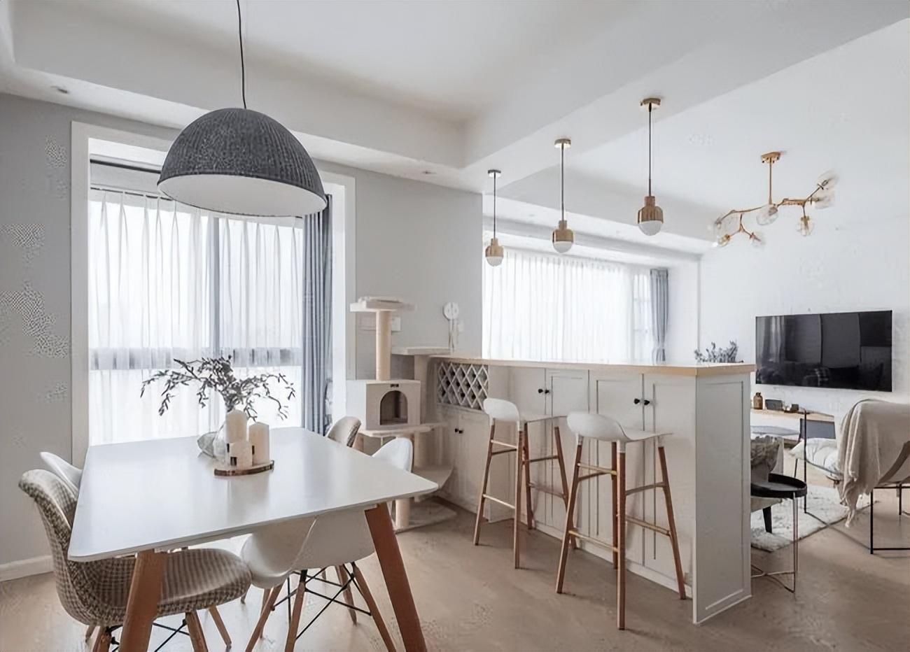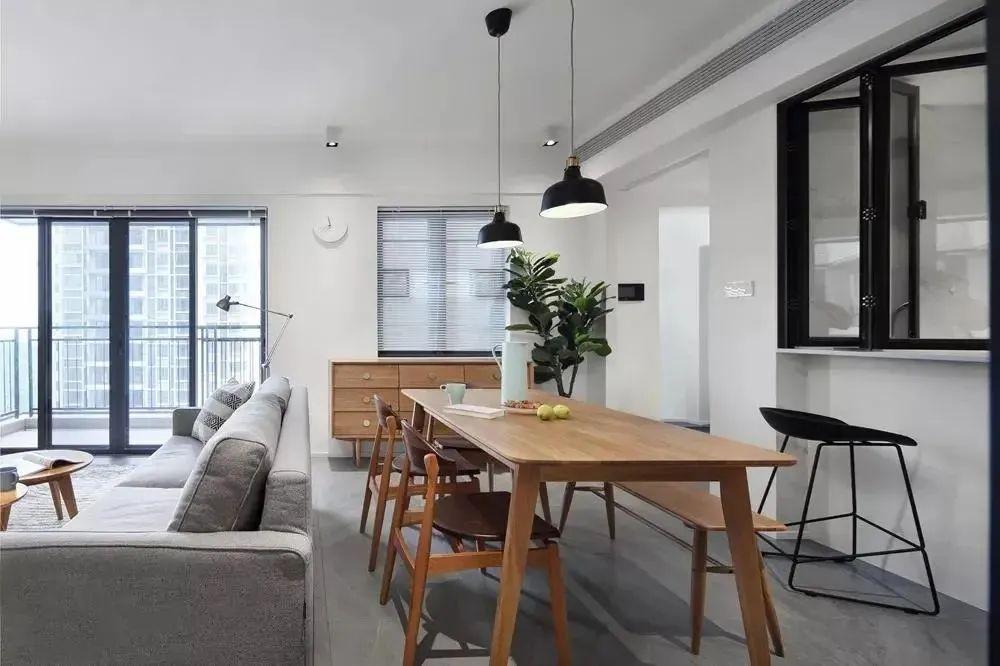 很多讲究坐着要有靠山,沙发不靠墙,感觉不踏实。这时,可以选择在客餐厅中间砌个矮墙,然后沙发靠着矮墙布置,既能缓解不踏实的感受,又能保持空间的通透大方。