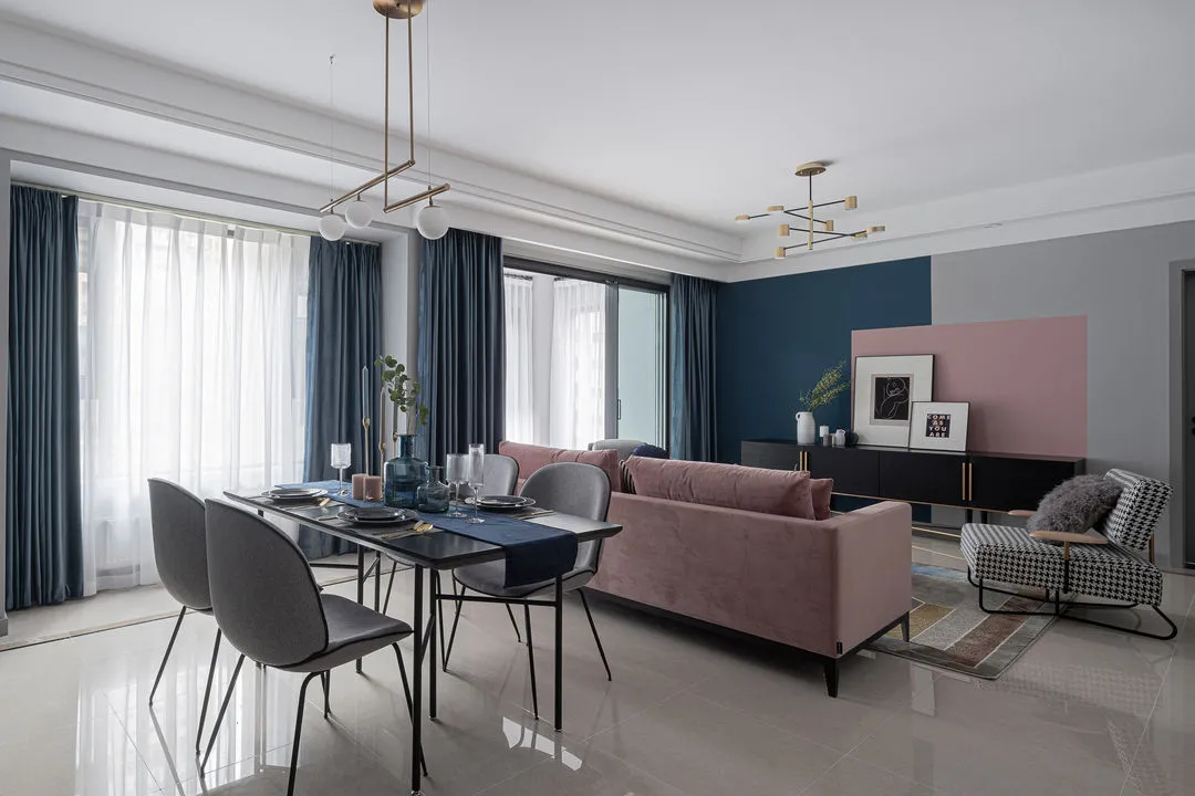 若是没有风水上的忌讳,这是最常见的设计方式,根据沙发摆放的位置将空间分隔开来。沙发居中,直接在沙发后方布置餐桌椅,这也是横厅户型中比较常见的布置方案。